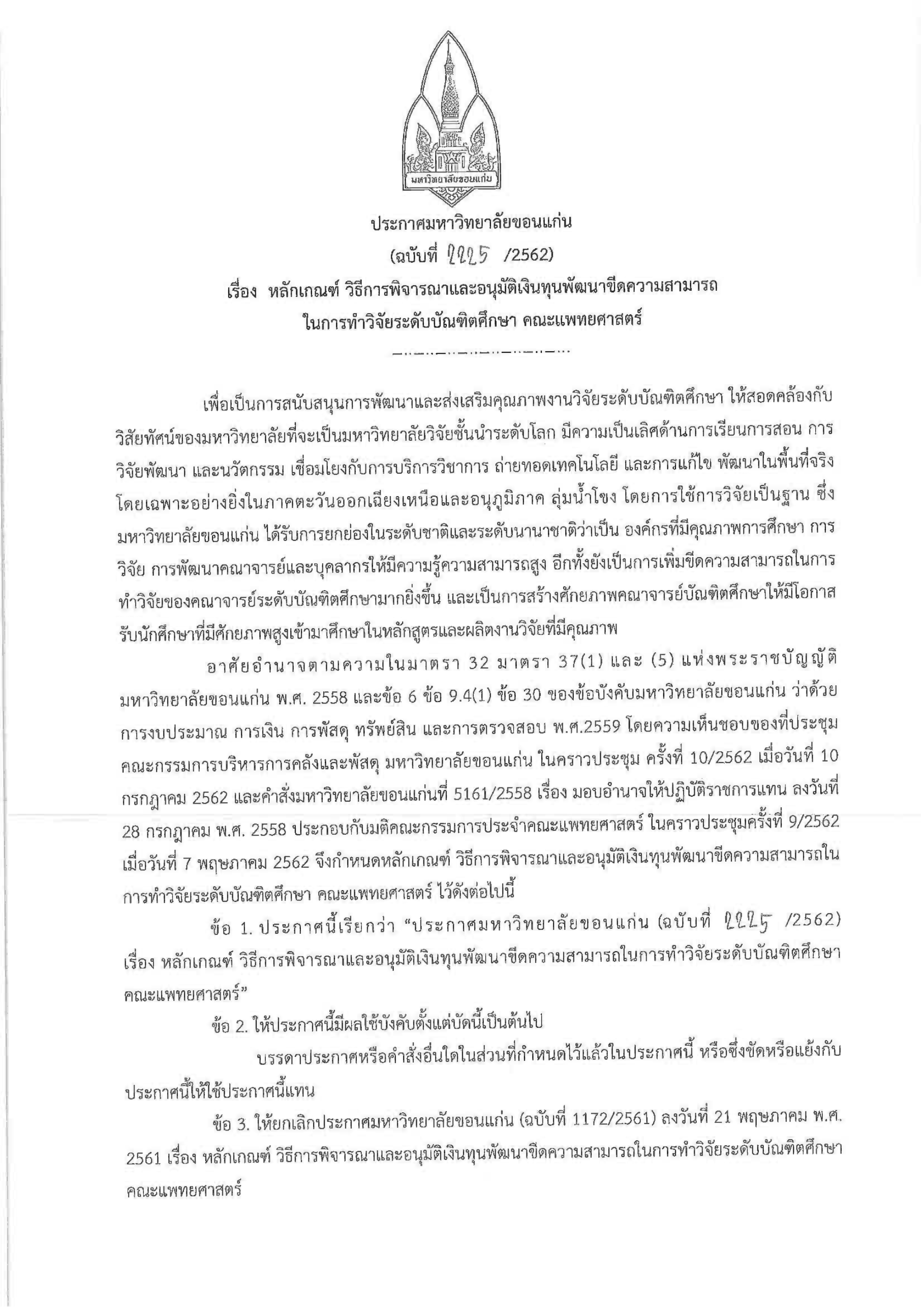 ประกาศฉบับที่ 2225/2562 หลักเกณฑ์ วิธีการพิจารณาและอนุมัติเงินทุนพัฒนาขีดความสามารถในการทำวิจัยระดับบัณฑิตศึกษา คณะแพทยศาสตร์
