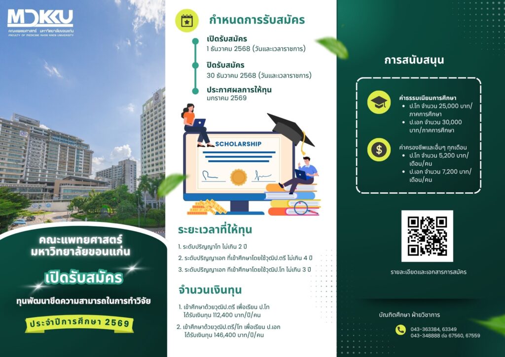 เปิดรับสมัครแล้ว “ทุนพัฒนาขีดความสามารถในการทำวิจัย คณะแพทยศาสตร์ มหาวิทยาลัยขอนแก่น ประจำปีการศึกษา 2569”