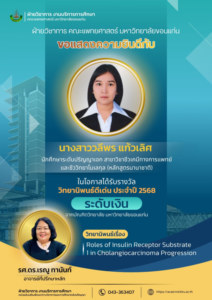 - รางวัลวิทยานิพนธ์ดีเด่น ประจำปี 2568 “ระดับเงิน” นางสาววลีพร แก้วเลิศ นักศึกษาระดับปริญญาเอก สาขาวิชาชีวเคมีทางการแพทย์และชีววิทยาโมเลกุล (หลักสูตรนานาชาติ) วิทยานิพนธ์เรื่อง Roles of insulin receptor substrate 1 in cholangiocarcinoma progression โดยมี รศ.ดร.เรณู ทานันท์ เป็นอาจารย์ที่ปรึกษาหลัก
