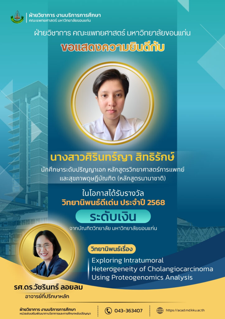 - รางวัลวิทยานิพนธ์ดีเด่น ประจำปี 2568 “ระดับเงิน” นางสาวศิรินทร์ญา สิทธิรักษ์ นักศึกษาระดับปริญญาเอก หลักสูตรวิทยาศาสตร์การแพทย์และสุขภาพดุษฎีบัณฑิต (หลักสูตรนานาชาติ) วิทยานิพนธ์เรื่อง Exploring intratumoral heterogeneity of cholangiocarcinoma using proteogenomics analysis โดยมี รศ.ดร.วัชรินทร์ ลอยลม เป็นอาจารย์ที่ปรึกษาหลัก