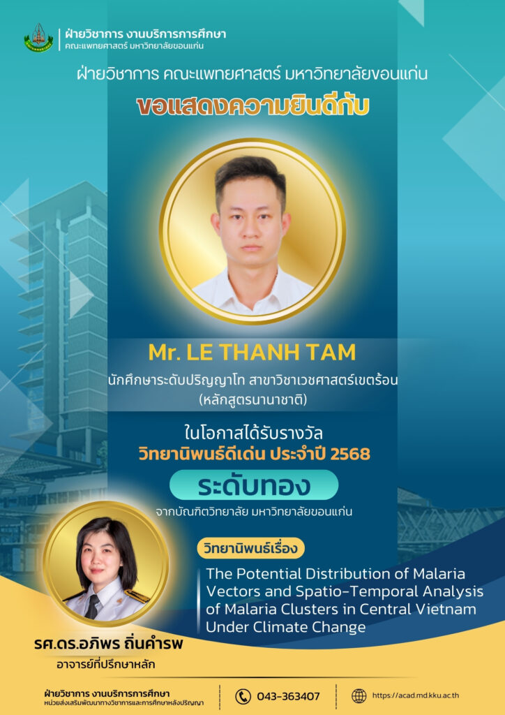 - รางวัลวิทยานิพนธ์ดีเด่น ประจำปี 2568 “ระดับทอง” Mr. LE THANH TAM นักศึกษาระดับปริญญาโท สาขาวิชาเวชศาสตร์เขตร้อน (หลักสูตรนานาชาติ) วิทยานิพนธ์เรื่อง The Potential Distribution of Malaria Vectors and Spatio-temporal Analysis of Malaria Clusters in Central Vietnam under Climate Change โดยมี รศ.ดร.อภิพร ถิ่นคำรพ เป็นอาจารย์ที่ปรึกษาหลัก