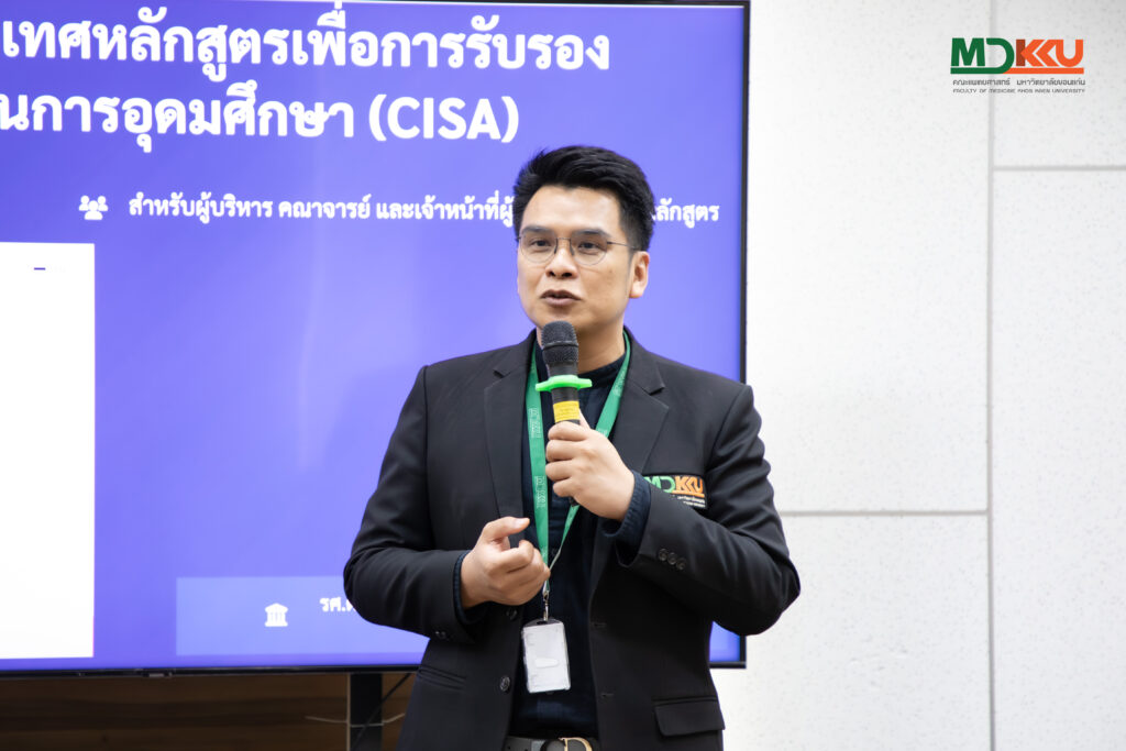 8 เมษายน 2569 คณะแพทยศาสตร์ มหาวิทยาลัยขอนแก่น โดยฝ่ายวิชาการ จัดอบรมเชิงปฏิบัติการใช้งานระบบระบบสารสนเทศหลักสูตรเพื่อการรับรองมาตรฐานการอุดมศึกษา (CISA) อย่างมีประสิทธิภาพ รองรับการเสนอหลักสูตรใหม่และหลักสูตรปรับปรุง เชื่องโยงข้อมูลมาตรฐานการอุดมศึกษาแบบบูรณาการ และยกระดับความโปร่งใสและประสิทธิภาพการพิจารณา ได้รับเกียรติจาก รศ.นพ.โกสินทร์ วิระษร รองคณบดีฝ่ายวิชาการ พร้อมด้วย รศ.ดร.สพ.ญ.รักษวรรณ ดีโนนโพธิ์ ผู้ช่วยฝ่ายวิชาการด้านบัณฑิตศึกษาปรีคลินิก ร่วมกล่าวต้อนรับวิทยากรและคณาจารย์ เจ้าหน้าที่สายสนับสนุน วิทยากรดำเนินกิจกรรมประกอบไปด้วย รศ.ดร.วรรณวิภา แก้วประดิษฐ์ พลพินิจ รองผู้อำนวยการฝ่ายวิชาการสำนักบริหารพัฒนาวิชาการมหาวิทยาลัยขอนแก่น นางณัฐมา ขำศิริ หัวหน้างานหลักสูตรและสหกิจศึกษา และ นางมัทรี วรรณชัย นักวิชาการศึกษาชำนาญการ กิจกรรมจัดขึ้น ณ ห้องประชุม Hybrid 1-2 อาคารเตรียมวิทยาศาสตร์คลินิก